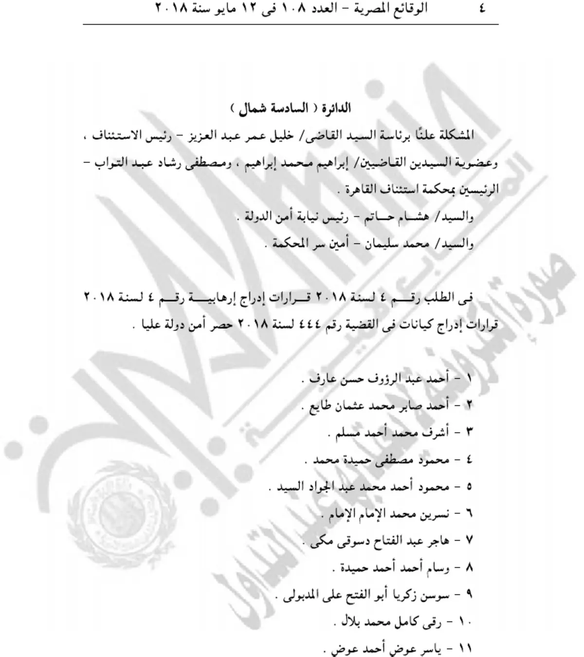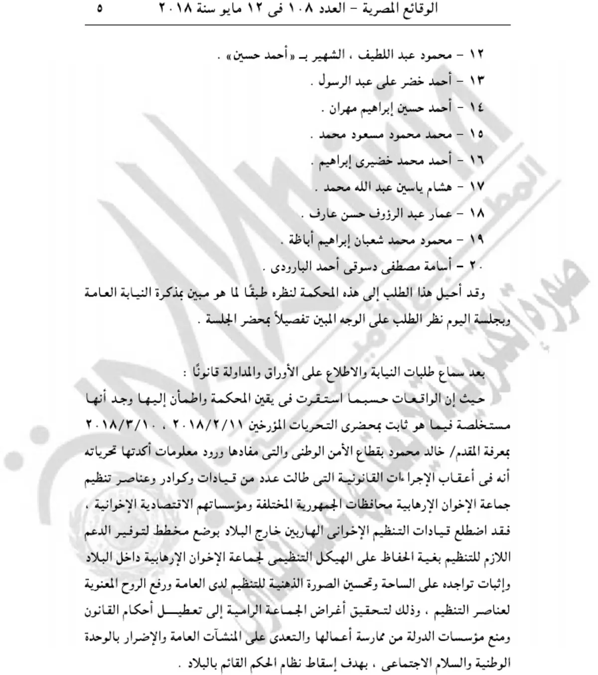 وكانت محكمة جنايات القاهرة قضت بإدراج 20 متهمًا على قائمة الإرهابيين بينهم 4 سيدات على ذمة القضية رقم 444 لسنة 2018 حصر أمن دولة عليا، وذلك لمدة 5 سنوات تبدأ من تاريخ صدور هذا القرار.