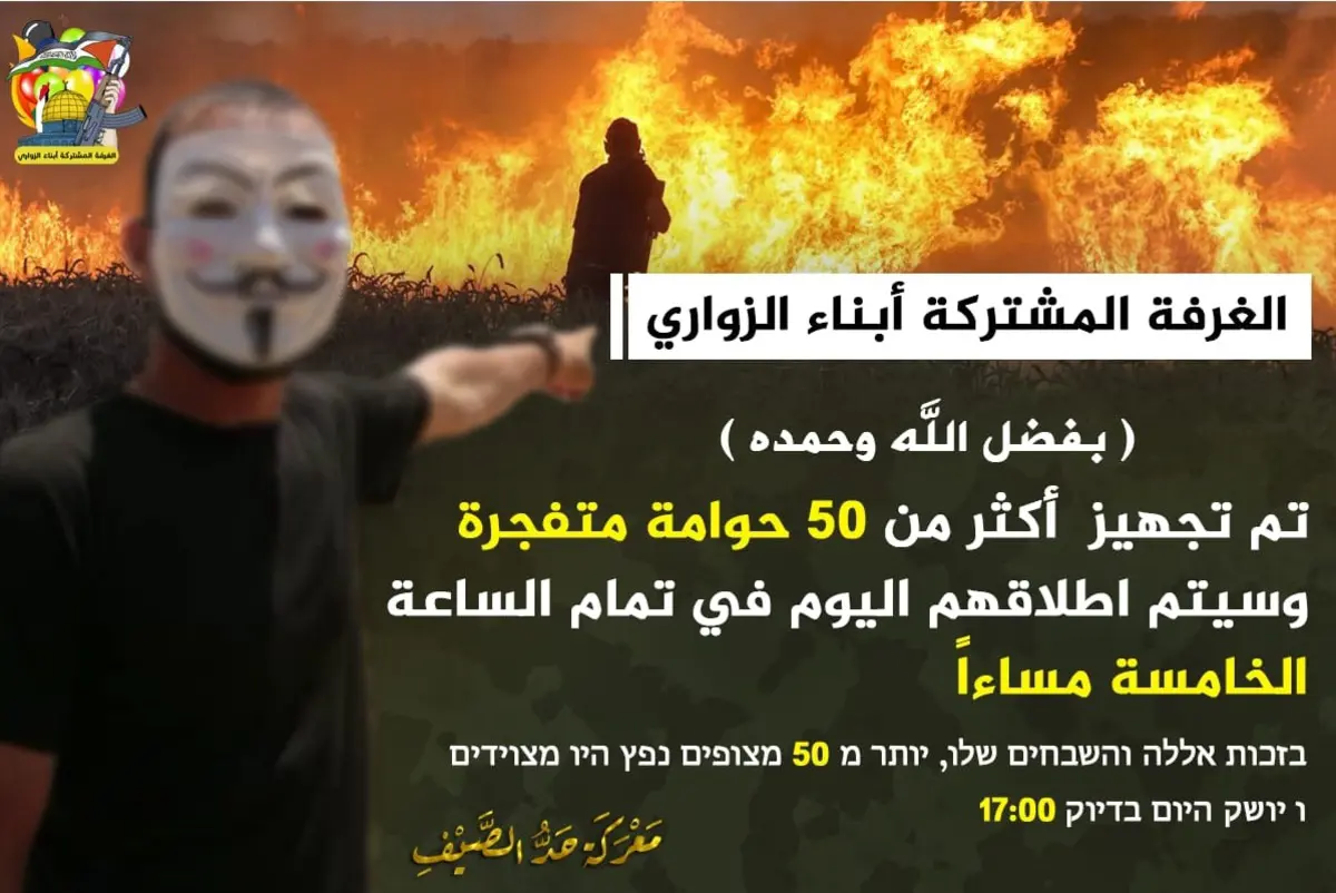 أعلنت ما تسمى "الغرفة المشتركة أبناء الزاوي" التي تشارك في إطلاق البالونات الحارقة في قطاع غزة اليوم الجمعة، أنها ستقوم بإطلاق 50 حوامة متفجرة نحو الأراضي المحتلة، خلال فعاليات الجمعة 59 لكسر الحصار.