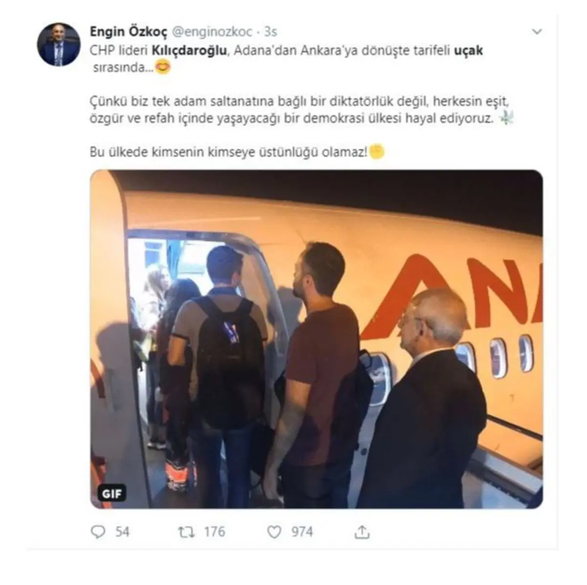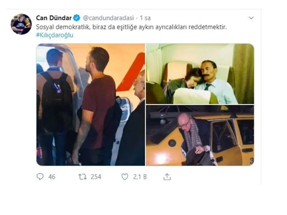 وأضاف معلق آخر: "زعيم حزب الشعب الجمهوري كليجدار أوغلو في دوره على الرحلة المخفضة في عودته من أضنة إلى أنقرة.. لأننا نحلم ببلد ديمقراطي يعيش فيه الجميع بحرية ورفاه وعدالة لا بدكتاتورية مرتبطة بسلطنة رجل واحد. لا توجد أفضلية لأحد على أحد في هذا البلد".