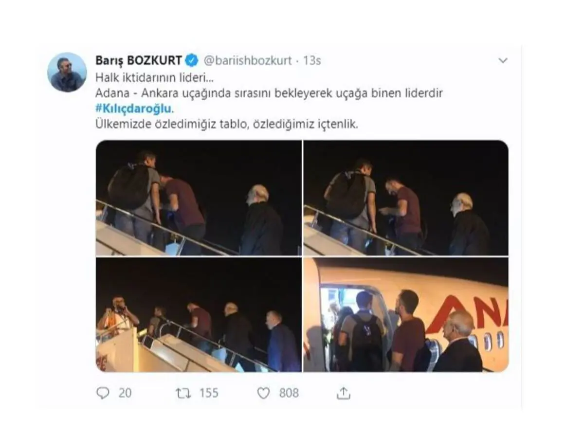 وبحسب تقرير نشره موقع ”توكنماز خبر“: "تظهر الصورة رئيس حزب الشعب الجمهوري كمال كليجدار اوغلو وهو عائد من أضنة إلى أنقرة بعد مشاركته في احتفالات الذكرى الرابعة لتأسيس جمعية أفشار العالم، على متن إحدى رحلات الطيران المخفضة".