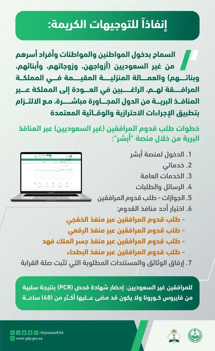 وأضافت أنه "يتعين على المواطنين والمواطنات الراغبين في العودة إلى المملكة عبر المنافذ البرية، إرفاق الوثائق والمستندات التي تثبت صلة القرابة للمرافقين معهم (من غير السعوديين) للحصول على الموافقة المسبقة قبل وصولهم للمنفذ".