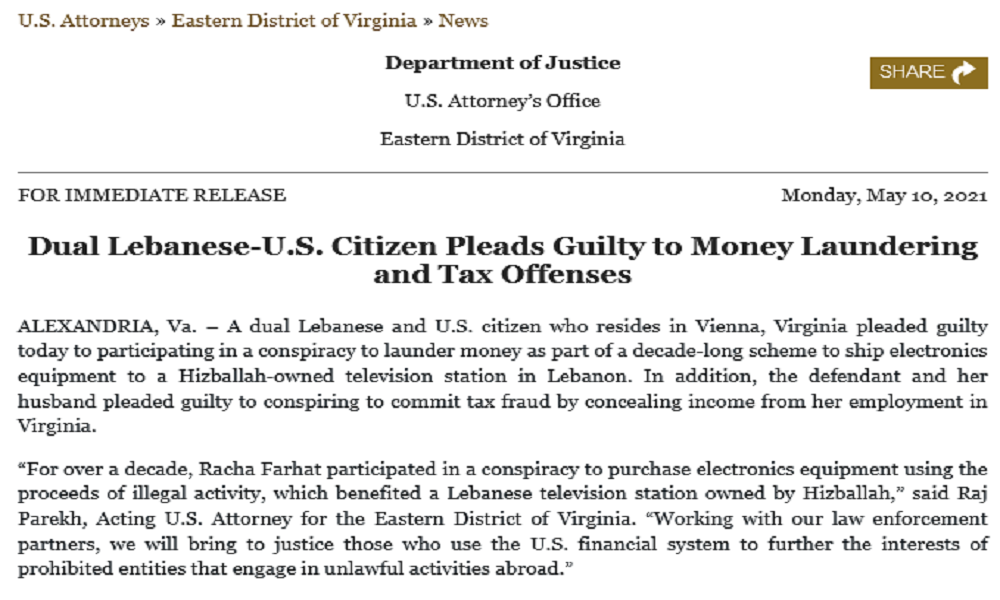 وأشار بيان نشر على موقع دائرة الادعاء العام الأمريكية لشرق فرجينيا، إلى أن رشا فرحات (44 عاما) اعترفت بأنها "مذنبة في المشاركة بمؤامرة لغسيل الأموال كجزء من مخطط استمر لعقد من الزمن لشحن معدات إلكترونية إلى محطة تلفزيونية مملوكة لحزب الله في لبنان. كما أقرت هي وزوجها بالذنب في التآمر لارتكاب الاحتيال الضريبي عن طريق إخفاء الدخل من عملها في فرجينيا".