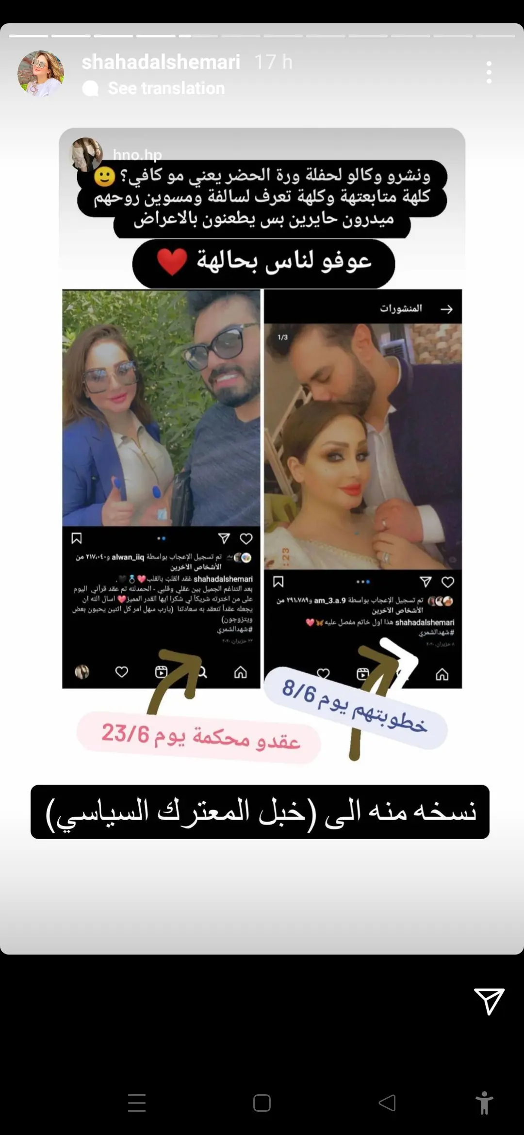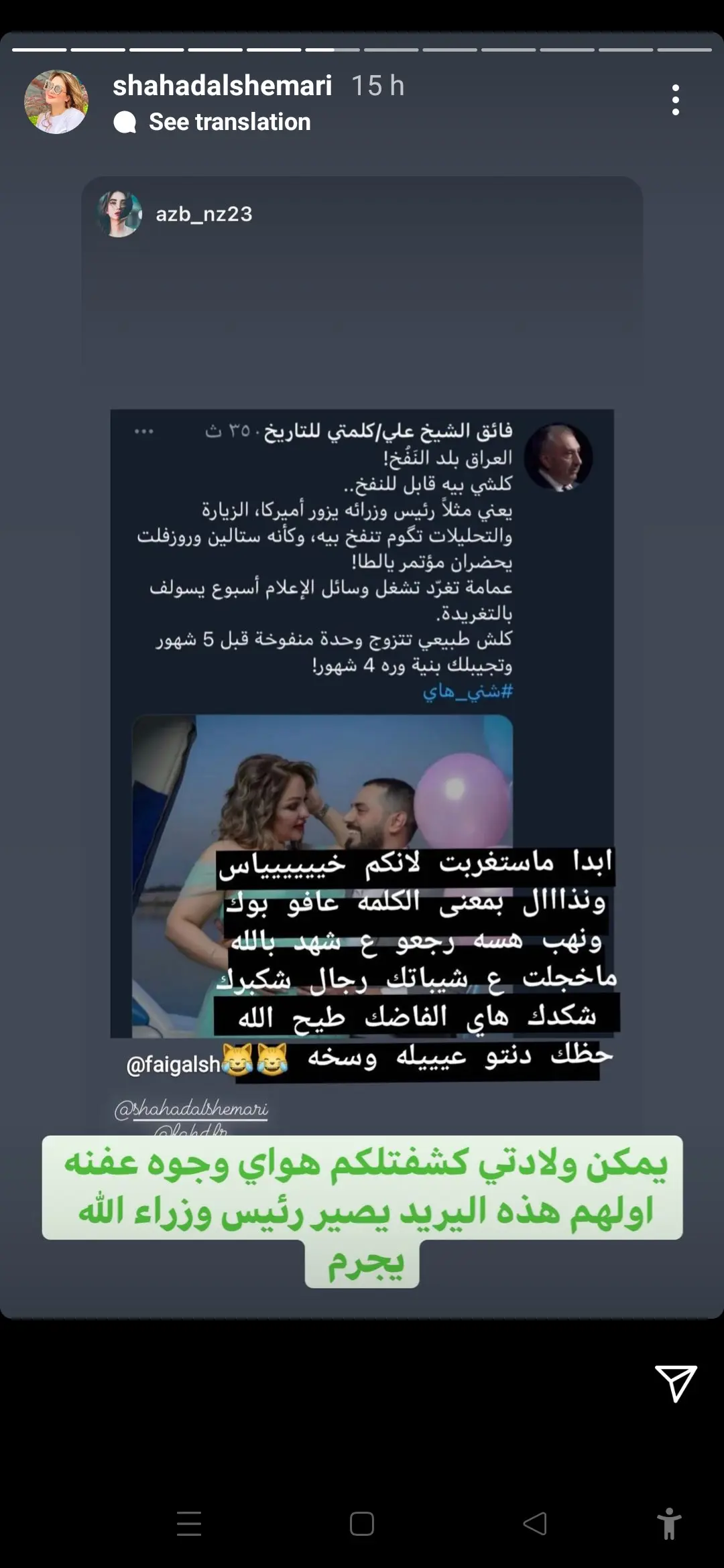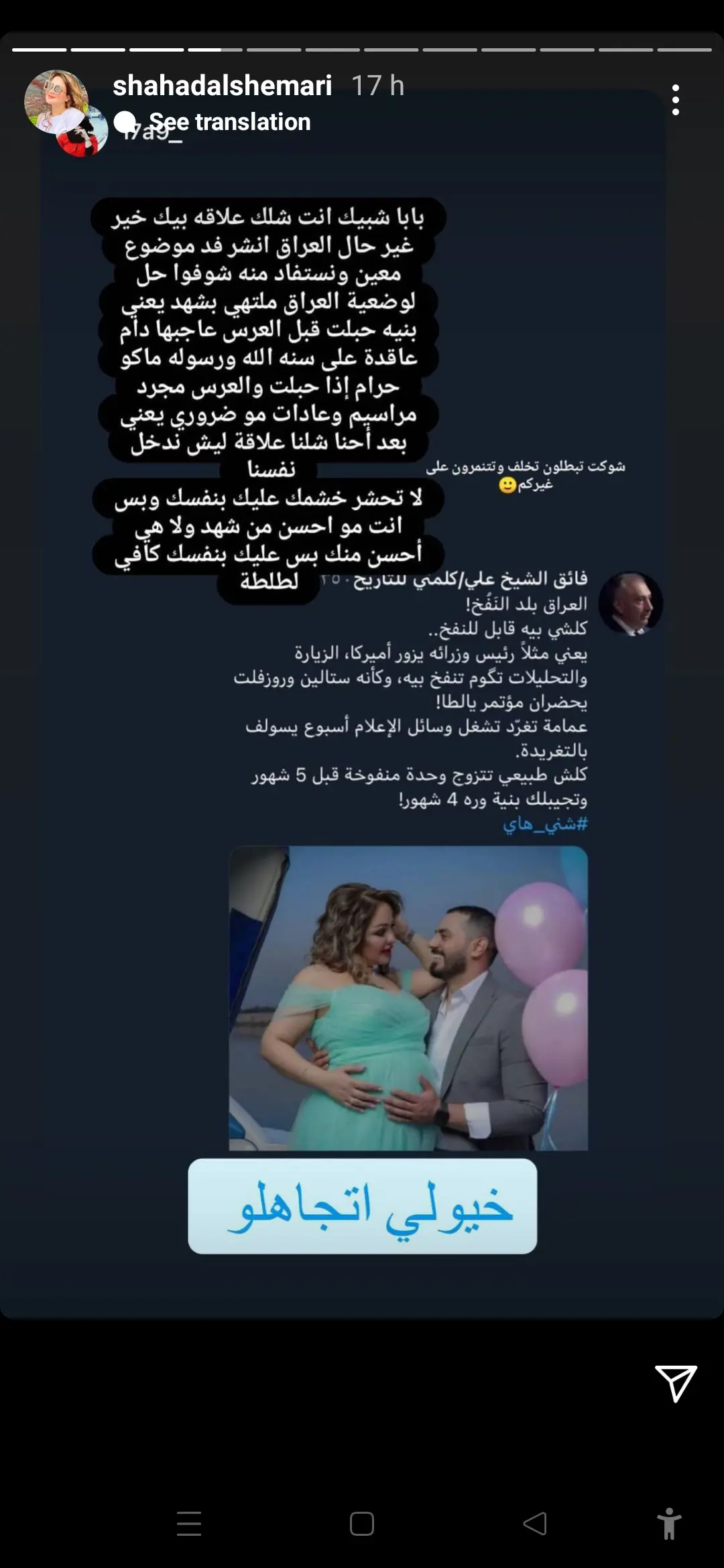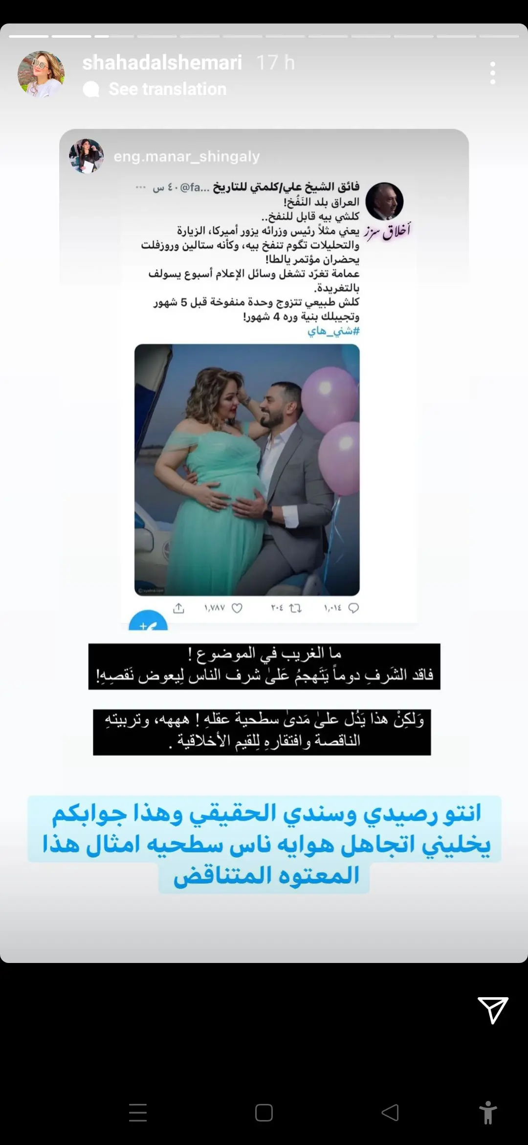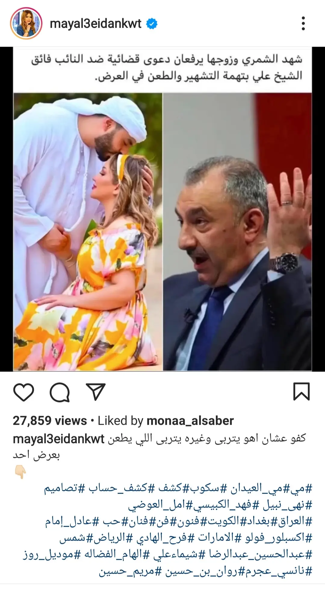 وأعلنت الإعلامية الكويتية مي العيدان، عن لجوء شهد الشمري للقضاء، بعد أن تعرض لها فائق الشيخ علي، باتهامات تتضمن طعنًا في عرضها، وذلك بعد وضعها مولودتها الأولى "ناي" من زوجها فهد زيد، قبل 3 أيام.