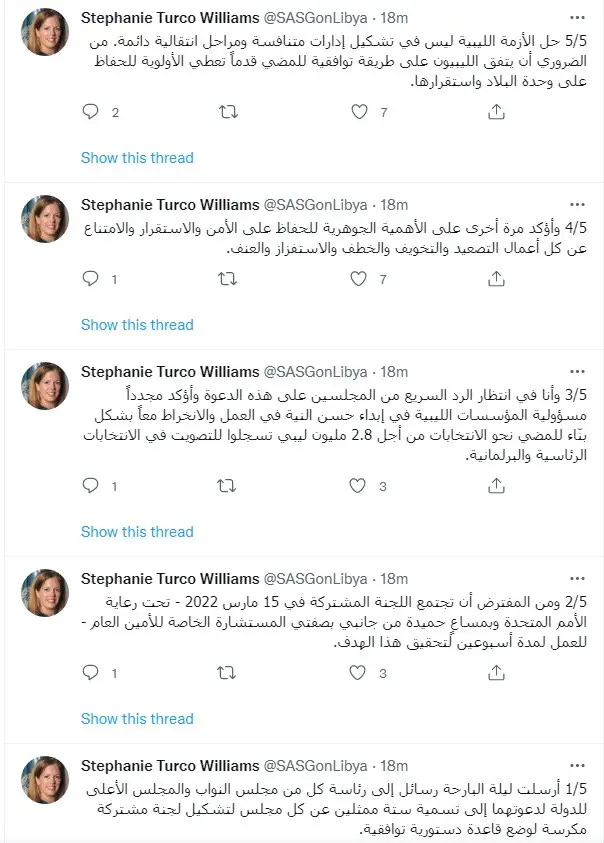 وتابعت ويليامز: "وأنا في انتظار الرد السريع من المجلسين على هذه الدعوة، وأؤكد مجددا مسؤولية المؤسسات الليبية في إبداء حسن النية في العمل والانخراط معا بشكل بنّاء للمضي نحو الانتخابات من أجل 2.8 مليون ليبي سجلوا للتصويت في الانتخابات الرئاسية والبرلمانية".
