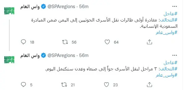 وكان التحالف العربي لدعم الشرعية في اليمن، قد أعلن، اليوم الجمعة، مغادرة أولى طائرات نقل الأسرى الحوثيين إلى اليمن، في إطار المبادرة السعودية.