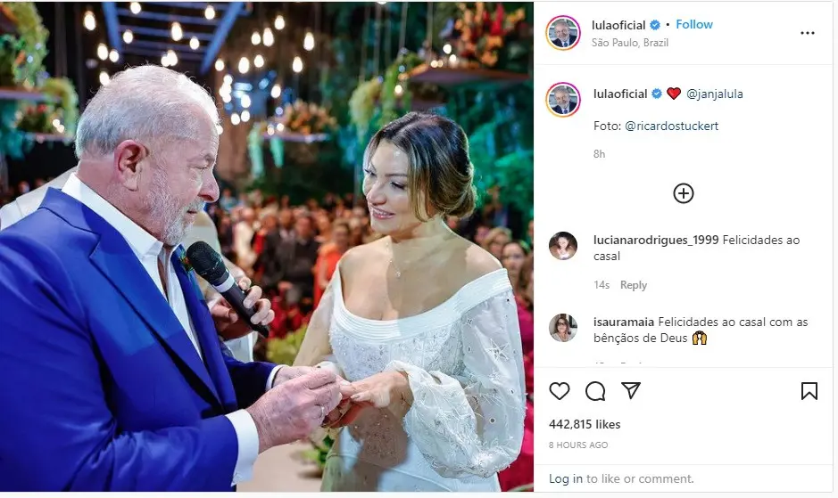 ونشر لولا (76 عامًا) صورة على إنستغرام التقطت خلال الزفاف في قاعة لإحياء الحفلات في حي بروكلين السكني بساو باولو.