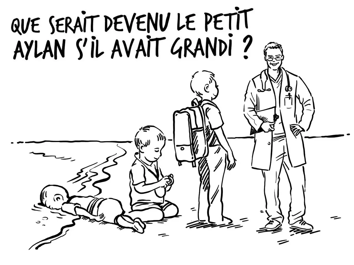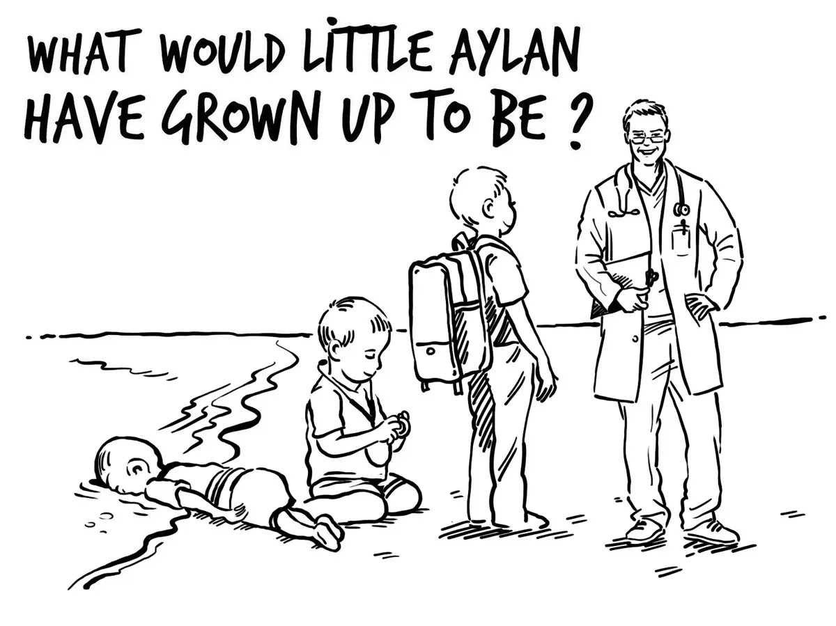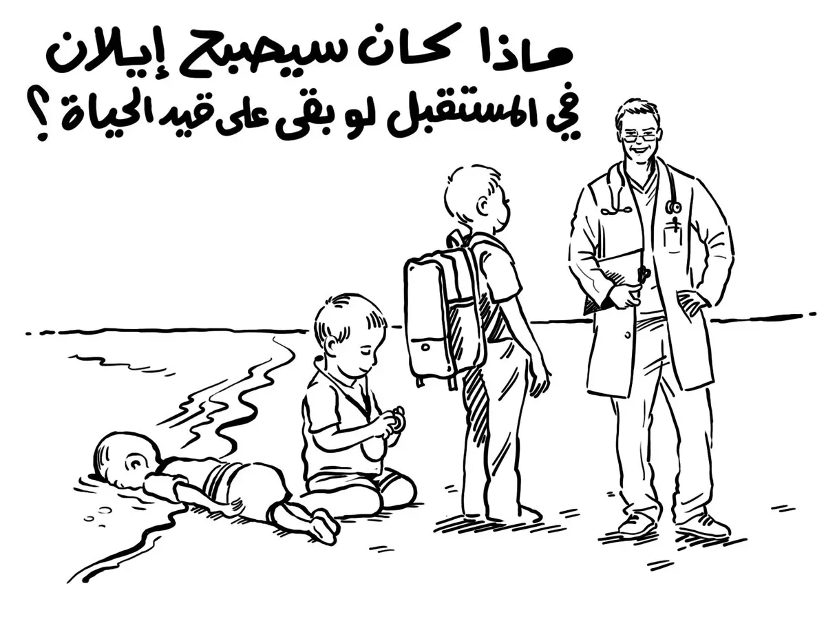 ونشرت الملكة رانيا على حسابيها في فيسبوك وتويتر أمس، رسما كاريكاتوريا، من تصميم رسام الكاريكاتور الأردني أسامة حجاج، يتنبأ بمستقبل زاهر للطفل الغريق، فكان من الممكن أن يصبح طبيبا وليس متحرشا بالنساء كما رسمته الصحيفة الفرنسية الساخرة.