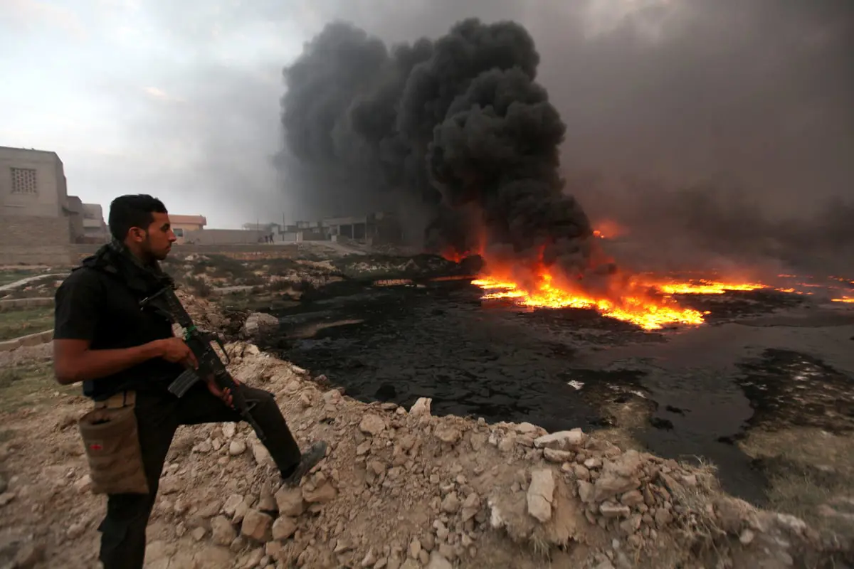 وأقدم التنظيم مع بدء معركة القيارة على إحراق العديد من آبار النفط بمحيط الناحية، بهدف حجب الرؤية وتجنب قصف مقاتلات التحالف الدولي، الأمر الذي خلف أعمدة كثيفة من الدخان الأسود يغطي سماء المنطقة والقرى المحيطة بها.