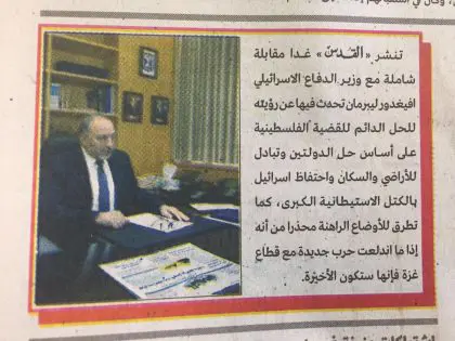 ونشرت الصحيفة -واسعة الانتشار في فلسطين- في وقت سابق من اليوم الأحد، تنويهًا مقتضبًا قالت فيه إنها "ستنشر غدًا الاثنين، لقاءً شاملًا مع ليبرمان، للحديث عن عدد من الملفات المهمة، مع صورة خاصة للوزير أمامه الصحيفة".