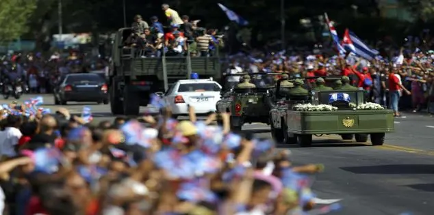 وحمل رماد كاسترو على عربة مقطورة تجرها سيارة جيب عسكرية خضراء قامت برحلة امتدت نحو ألف كيلومتر حيا خلالها مئات الآلاف من الكوبيين زعيمهم الراحل بعد أن اصطفوا على جوانب الطرق التي مر بها.