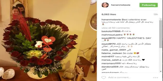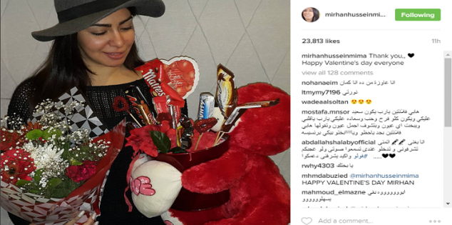 ونشرت الفنانة المصرية ميريهان حسين صورة لها بعد تلقيها هدية الفلانتين دون أن تفصح عن مصدرها قائلة :"أشكرك.. وعيد حب سعيد على كل الناس".
