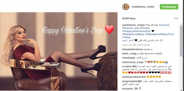 بينما وجهت المطربة اللبنانية مادلين مطر رسالة لجمهورها في عيد الحب عبر حسابها الرسمي على موقع انستغرام، قائلة :"لكل حبايبي وأصدقائي وعائلتي كل عيد حب وانتوا طيبين".