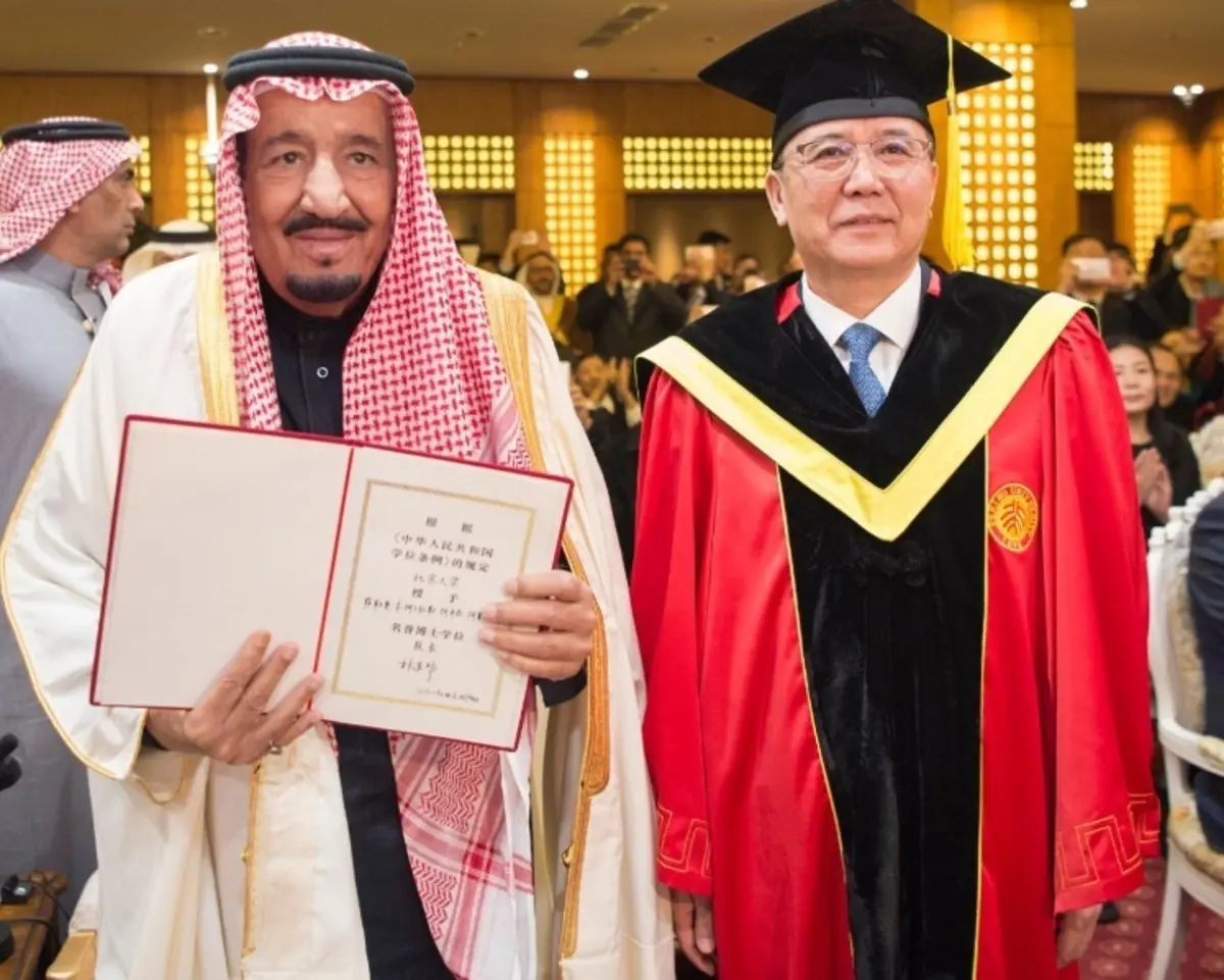 وعقب ذلك تسلّم خادم الحرمين الشريفين، شهادة درجة الدكتوراة الفخرية، التي مُنحت له من جامعة بكين.
