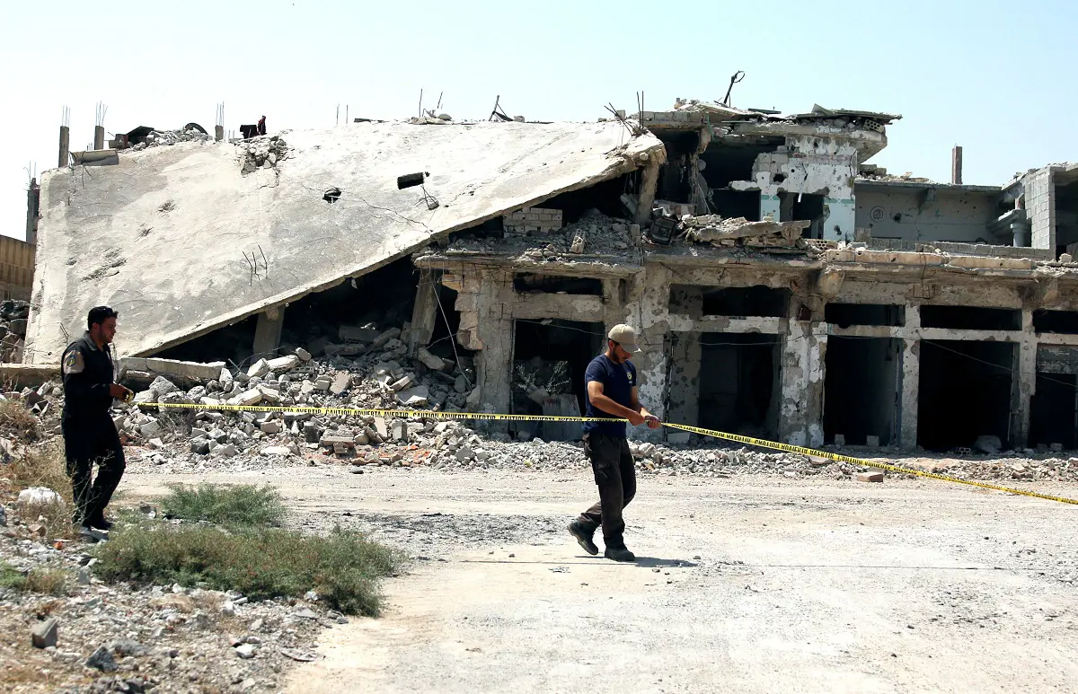 يختبئ أعضاء الفريق الذين يرتدون زيًّا واقيًا خلف أكوام التراب أو خلف مبانٍ. ويحذّر رجل يحمل جهاز تفجير متصلًا بالسلك الأحمر زملاءه باللاسلكي. ثم يتصاعد التراب والحطام، ويقل عدد القنابل غير المنفجرة في شوارع درعا.