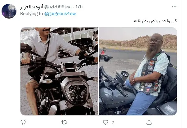 ونشر مغرد باسم "ابوعبدالعزيز" صورة الداعية عادل الكلباني التي أطل فيها راكباً دراجة نارية كذلك مع صورة الجوهر معلقا: "كل واحد يرقص بطريقته".