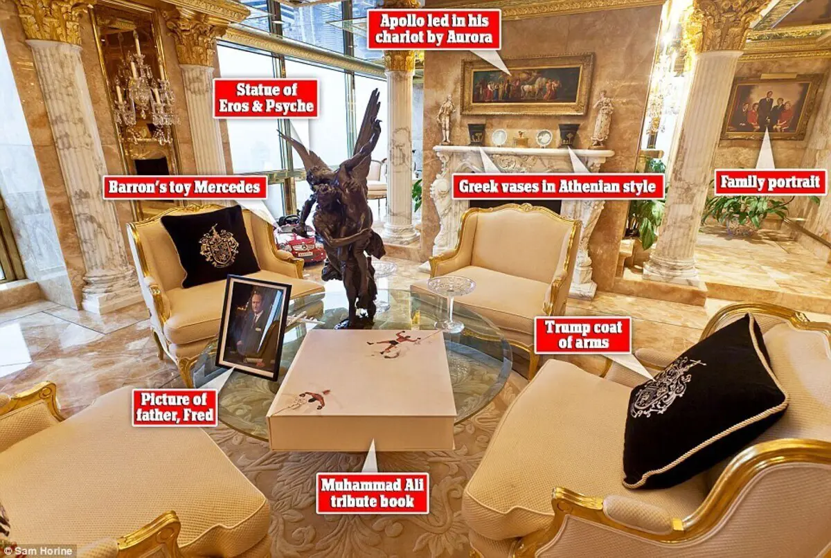 ويسكن القصر بالإضافة لترمب زوجته الثالثة ميلنيا وابنهما ذو التسع سنوات "بارون" والذي يملك سيارة صممتها شركة مرسيدس خصيصيا له وتحمل لوحة مرخصة من مدينة مانهاتن وابنته الحسناء البالغة من 34 عاما ايفانكا والتي تقود حملته الانتخابية، ولترمب ثلاثة أبناء من زوجاته السابقات هم دونالد جي آر و إريك وتيفاني.