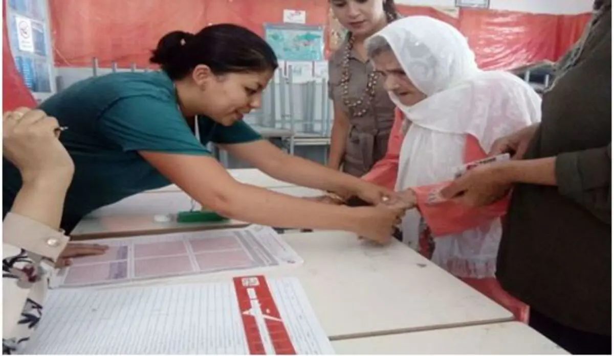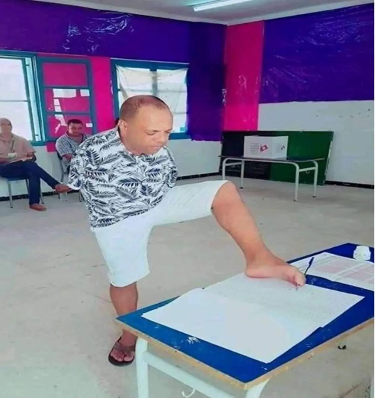 وظهر أحد الناخبين في صورة جرى تداولها على نطاق واسع، وهو يدلي بصوته عن طريق ساقيه، حيث لم تمنعه إعاقته من التنقل إلى مركز الاقتراع لاختيار مرشحه، وفق مغردين.