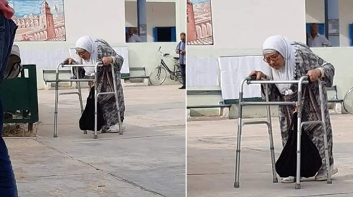 كما تداول ناشطون صورة أخرى لسيدة عجوز وهي تتوجه إلى مركز الاقتراع بمحافظة القيروان وسط تونس، حيث استعملت عكازها الحديدي للوصول إلى المقر الانتخابي.