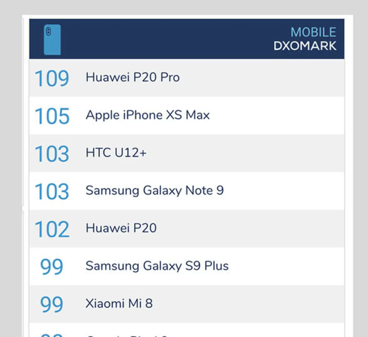 وكانت تلك الهواتف قد أحرزت نتائج عالية في الاختبارات، ولكن أيًا منهم لم يدنو من هاتف هواوي بي-20 برو، حيث حصل الأخير على 109 نقاط، بينما حل آيفون xs ماكس ثانيًا بـ 105 نقاط، وهواتف سامسونغ وإتش تي سي حصلت على 103 نقاط في المركز الثالث.