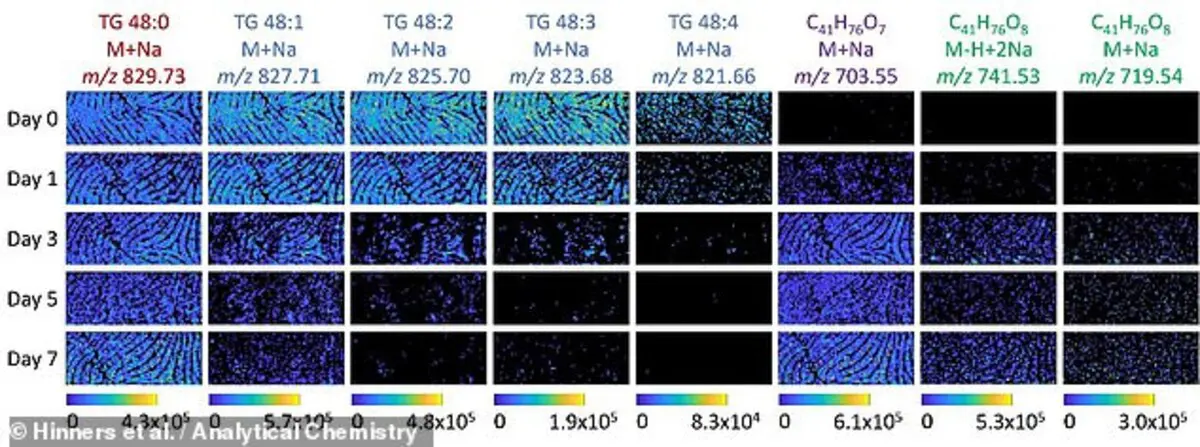 ووجد الباحثون أنهم يستطيعون تحديد معدل تحلل ثلاثي الجلسرين بدقة خلال الأسبوع، واكتشفوا أيضا أن معدل تدهور بصمات الأصابع قد بدا متباينا بين المتبرعين، ويرجع ذلك إلى تباين مستويات الدهون في أجسام المشاركين، حيث تؤدي زيادتها إلى تباطؤ معدل تحلل ثلاثي الجلسرين.