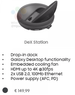 وبحسب موقع فاندرويد التقني، فإن التسريبات أظهرت جهازاً يحمل اسم Samsung Dex وهو عبارة عن قاعدة سيستقر فيها هاتف غلاكسي إس 8 الجديد، ويحتوي على مخرج HDMI لتوصيله بأي شاشة بحيث يمكن استعراض واجهة استخدام الهاتف على الشاشات الكبيرة، إلى جانب وجود فتحة USB-C وفتحتي USB 2.0.
