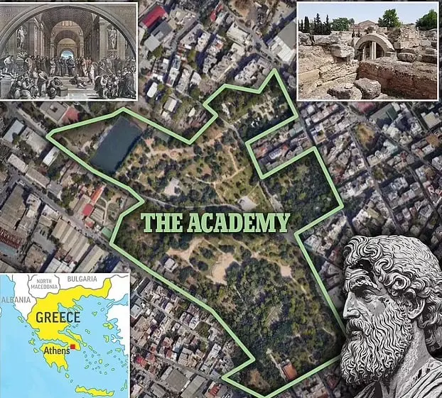 كانت الأكاديمية تقع في ضواحي أثينا على ممتلكات حصل عليها أفلاطون عام 387 قبل الميلاد، والتي تُعرف بأنها أول مؤسسة للتعليم العالي، وفق الصحيفة.