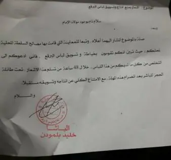 وفي وثيقة بعنوان "إشعار بمنع إنتاج وتسويق لباس البرقع" يقول ممثل وزارة الداخلية "تبعا للمعاينة التي قامت بها السلطة المحلية لمحلكم، حيث تبين أنكم تقومون بخياطة وتسويق لباس البرقع فإني أدعوكم إلى التخلص من كل ما لديكم من هذا اللباس خلال 48 ساعة من تسلم هذا الشعار، تحت طائلة الحجز المباشر بعد انصرام هذه المهلة".