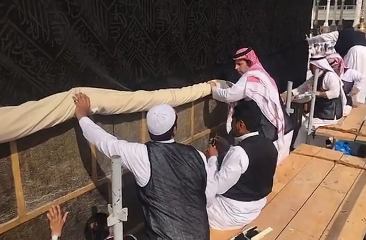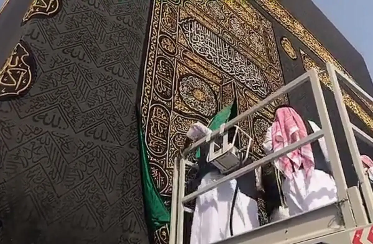 وأظهرت صور ومقاطع فيديو تداولها ناشطون على مواقع التواصل الاجتماعي جزءا من العملية، التي يقوم فيها الخياطون بتغطية الجزء المرفوع بإزار من القماش القطني الأبيض بعرض مترين تقريباً من الجهات الأربع.