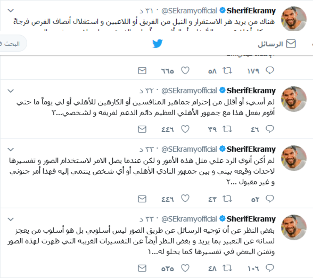 وقال إكرامي، عبر حسابه الرسمي بموقع تويتر: " بغض النظر عن أن توجيه الرسائل عن طريق الصور ليس أسلوبي، بل هو أسلوب من يعجز لسانه عن التعبير بما يريد، وبغض النظر أيضًا عن التفسيرات الغريبة التي ظهرت لهذه الصور وتفنن البعض في تفسيرها كما يحلو له".