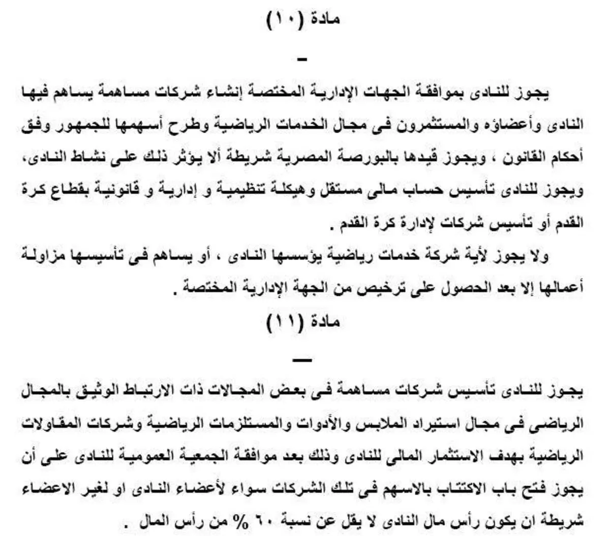 وكان مجلس إدارة الأهلي، قد قدم لائحة للجمعية العمومية للأهلي، التي وافقت عليها، وتحتوي المادة رقم 10، التي تنص على "إنشاء شركات رياضية مساهمة، وطرح أسهمها للجمهور"، ولم تنص المادة على حصة النادي الأهلي نفسه، بمعنى أنها لم تنص على أن النادي الأهلي له أكثر من 50% من الأسهم التي تعطيه حق الإدارة، ولكن اللجنة الأولمبية، رفضت اعتماد اللائحة؛ بسبب إقامة الجمعية العمومية على يومين، وتم الاحتكام للائحة الإرشادية.