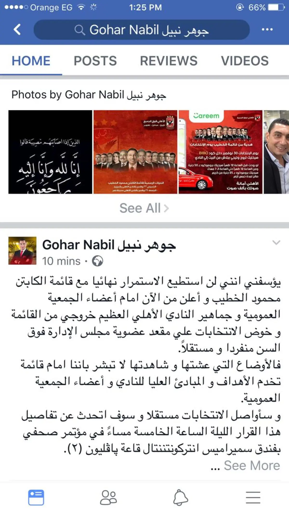 وأضاف نبيل في تدوينة على حسابه الرسمي بموقع التواصل الاجتماعي "فيسبوك"، اليوم الاثنين: "يؤسفني أنني لن أستطيع الاستمرار نهائيًا مع قائمة الكابتن محمود الخطيب، وأعلن من الآن أمام أعضاء الجمعية العمومية، وجماهير النادي الأهلي العظيم خروجي من القائمة، وخوض الانتخابات على مقعد عضوية مجلس الإدارة فوق السن منفردًا ومستقلًا".