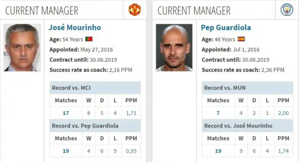 وستكون هذه المواجهة رقم 20 بين مدربي الفريقين، الإسباني بيب غوارديولا في مانشستر سيتي، والبرتغالي جوزيه مورينيو من مانشستر يونايتد.