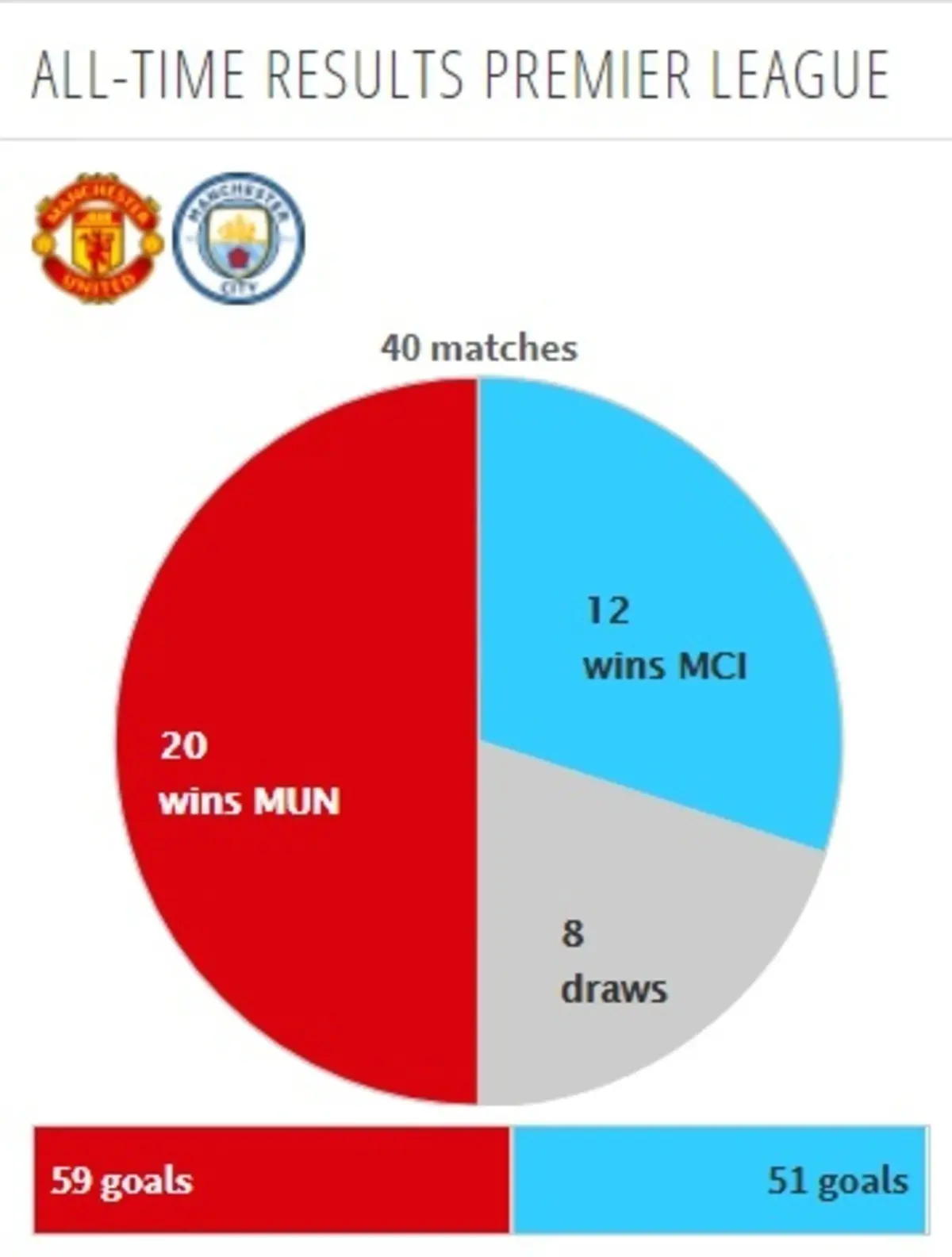 والتقى الفريقان 174 مرة، فاز مانشستر يونايتد في 72 مباراة مقابل 50 انتصارًا لمانشستر سيتي و52 تعادلًا.