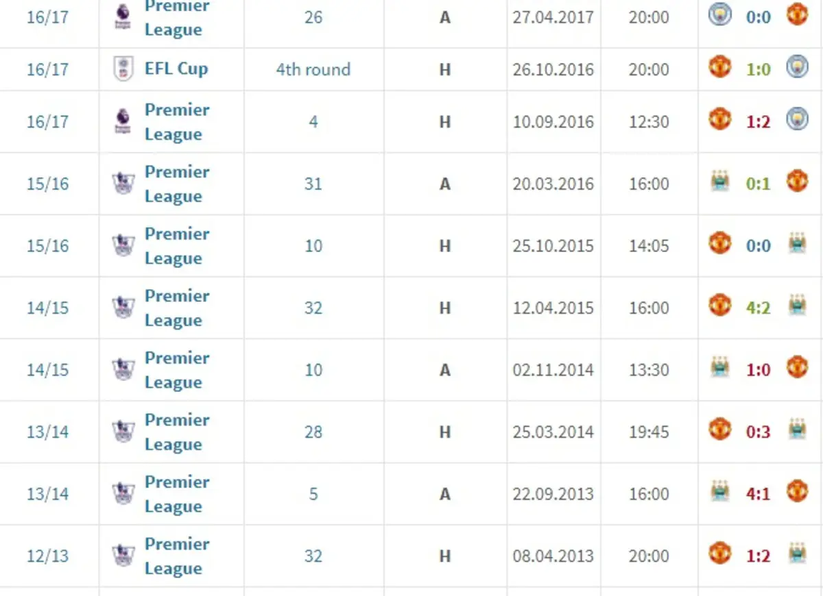 وفي آخر 10 مباريات رسمية بين الفريقين فاز مانشستر سيتي 5 مرات، مقابل 3 انتصارات لمانشستر يونايتد، في حين انتهت مباراتان بالتعادل.