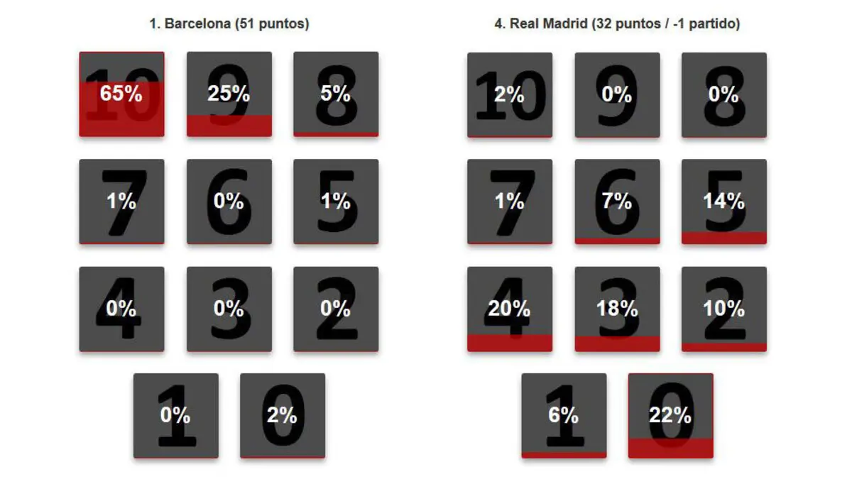 وحصل برشلونة على العلامة الكاملة 10 و9 لفالنسيا وجيرونا و8 لأتلتيكو مدريد وخيتافي و7 لريال بتيس وليغانيس وفياريال و6 لأتلتيك بلباو وإسبانيول، وهي الفرق التي تجاوزت المعدل.