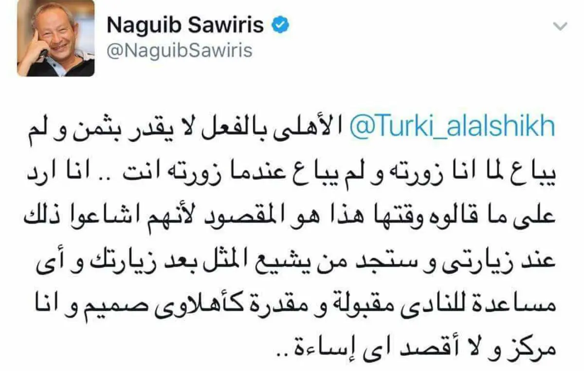 وعاد نجيب ساويرس ورد على آل الشيخ قائلًا: "الأهلي بالفعل لا يقدر بثمن، ولم يباع عندما زرته ولم يباع عندما زرته أنت، أنا أرد على ما قالوه وقتها هذا هو المقصود لأنهم أشاعوا ذلك، عند زيارتي، وستجد من يشيع المثل بعد زيارتك، وأي مساعدة مقبولة ومقدرة كأهلاوي صميم، وأنا مركز ولا أقصد أي إساءة".