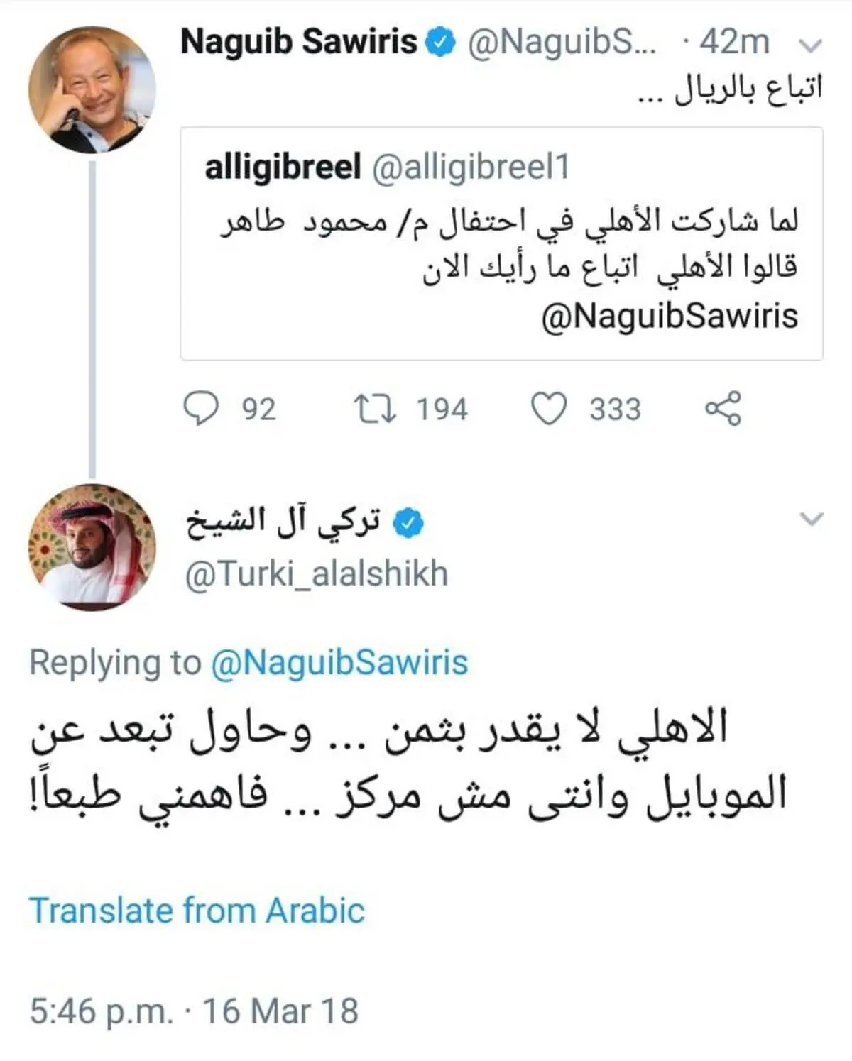 وردَّ تركي آل الشيخ على تغريدة ساويرس سريعًا بقوله: «الأهلي لا يقدَّر بثمن... وحاول تبعد عن الموبايل وأنت مش مركز... فاهمني طبعًا!".