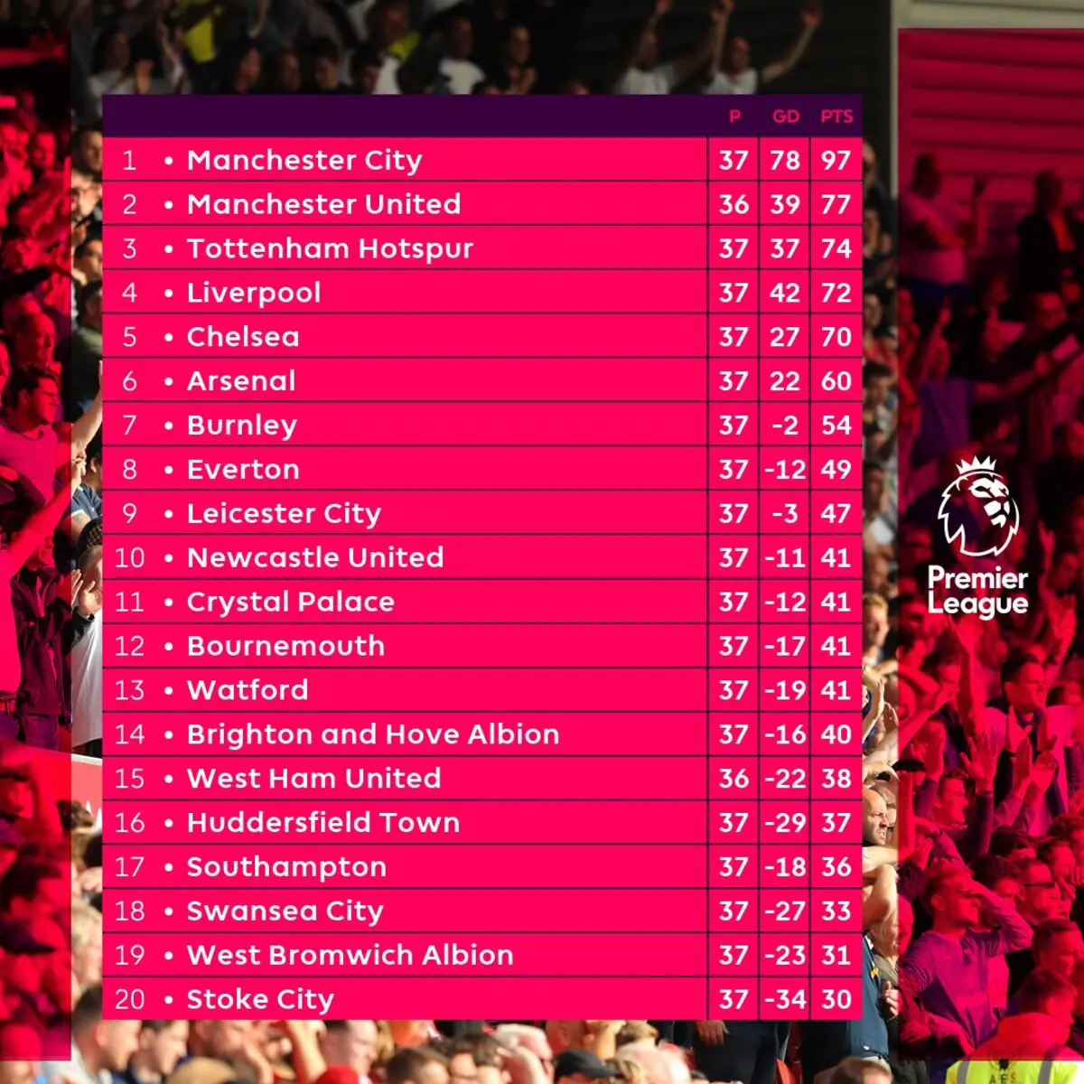 ويحتل ليفربول المركز الرابع بـ72 نقطة وفارق أهداف يبلغ + 42 هدفًا فيما يحل تشيلسي خامسًا برصيد 70 نقطة وفارق +27 هدفًا.