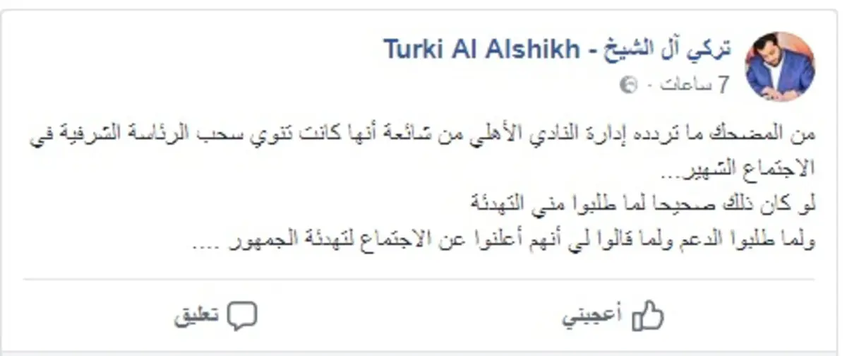 وقال تركي عبر صفحته على موقع التواصل الاجتماعي "فيسبوك": "من المضحك ما تردده إدارة النادي الأهلي من شائعة أنها كانت تنوي سحب الرئاسة الشرفية في الاجتماع الشهير".