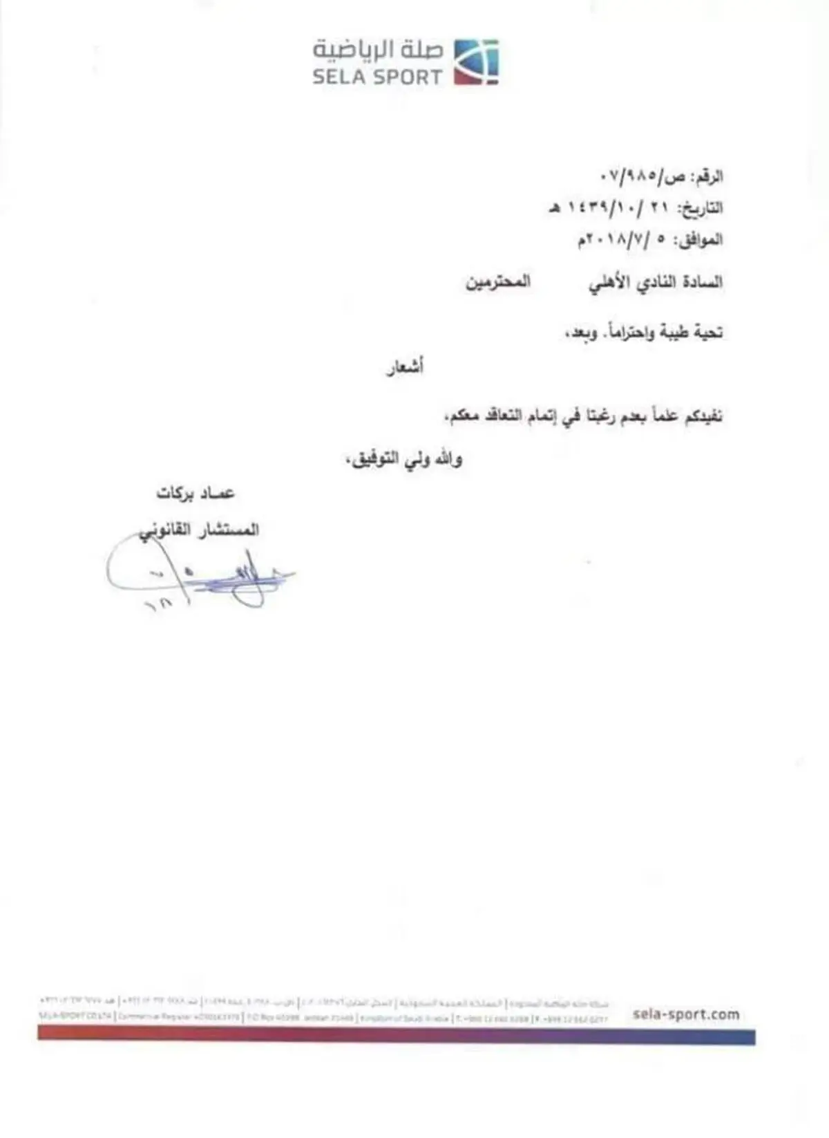 أرسلت شركة صلة السعودية، الراعي الرسمي للنادي الأهلي، خطابًا رسميًا لمجلس الإدارة برئاسة محمود الخطيب، تطلب خلاله عدم إتمام التعاقد للقلعة الحمراء.