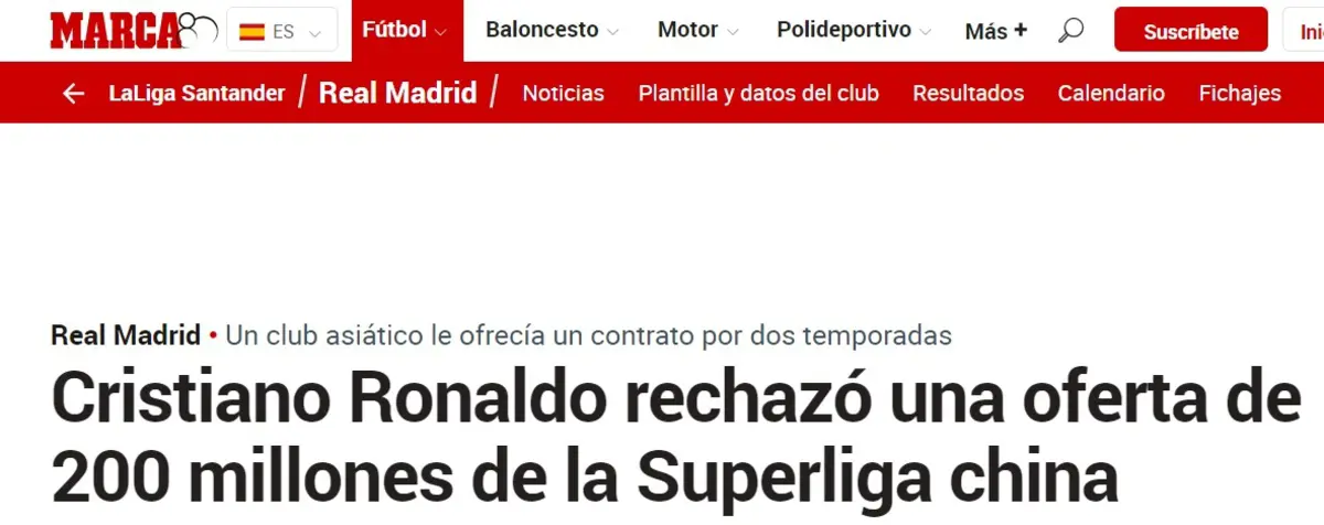 وقالت صحيفة "ماركا" الإسبانية، أن رونالدو رفض عرضًا ضخمًا من نادٍ صيني، يحصل من خلاله على 100 مليون يورو لمدة موسمين.