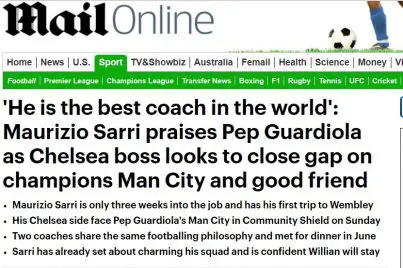 أشاد المدرب الإيطالي ماوريسيو ساري المدرب الجديد لنادي تشيلسي بمنافسه الإسباني بيب غوارديولا المدير الفني لمانشستر سيتي، قبل يوم واحد على مباراة الفريقين في درع اتحاد كرة القدم الإنجليزي.