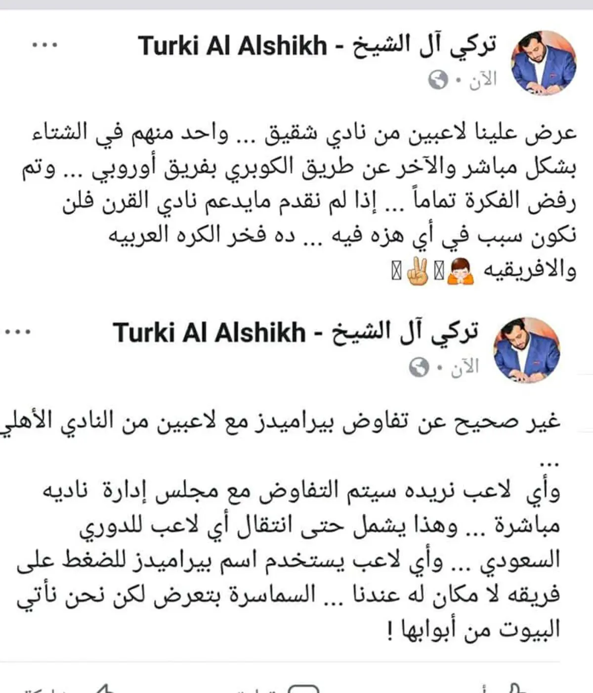 وقال تركي عبر حسابه الرسمي على موقع التواصل الاجتماعي "فيس بوك": "غير صحيح، تفاوض بيراميدز مع لاعبين من النادي الأهلي، وأي لاعب نريده سيتم التفاوض مع مجلس إدارة ناديه مباشرة".