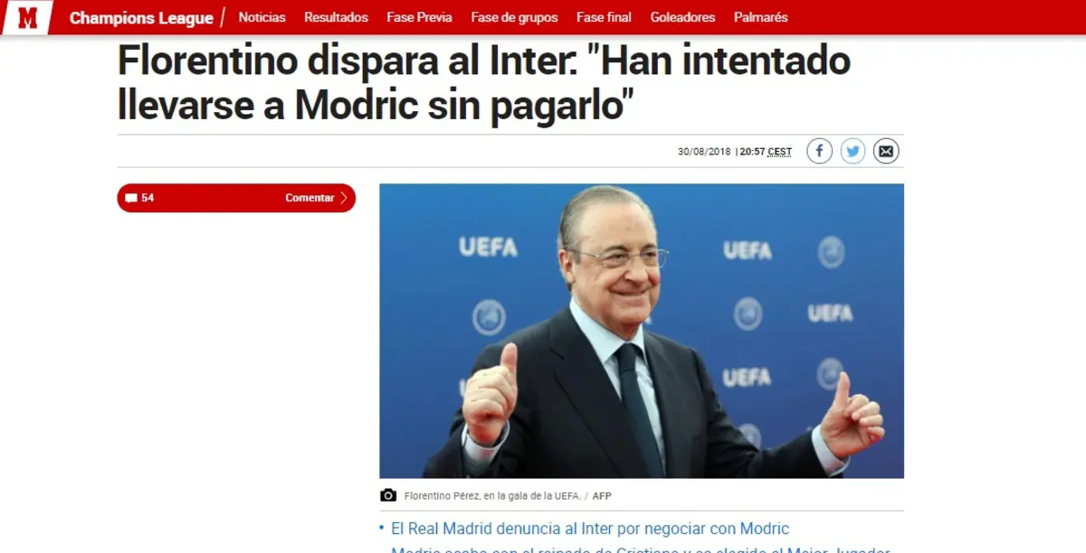 ويشير رئيس ريال مدريد إلى سعي إنتر ميلان الحثيث للتعاقد مع لاعب وسط ريال مدريد، الكرواتي لوكا مودريتش، الذي اختير أفضل لاعب في أوروبا للموسم الماضي 2017/2018.