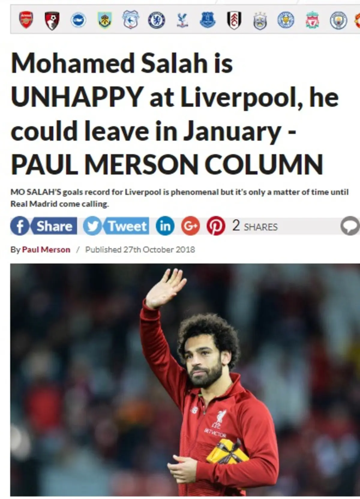 وآخرتم ميرسون "لقد شاهد مشجعو ليفربول اللاعبين الكبار يغادرون الفريق، سيكونون غاضبين إذا غادر صلاح أيضًا، ولكن هذا ما يحدث عندما ينجح اللاعب في الدوري الإنجليزي الممتاز، لن أكون مصدومًا إذا قدّم ريال مدريد عرضًا كبيرًا في يناير".