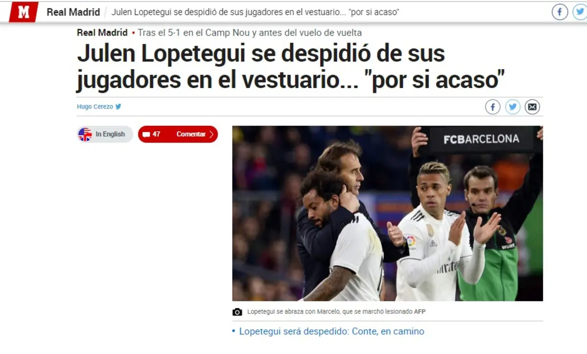وتأتي أنباء إقالة لوبتيغي بعد أن خسر ريال مدريد 1/5 أمام برشلونة في مباراة الكلاسيكو، على ملعب كامب نو، ضمن منافسات الجولة العاشرة من الدوري الإسباني.