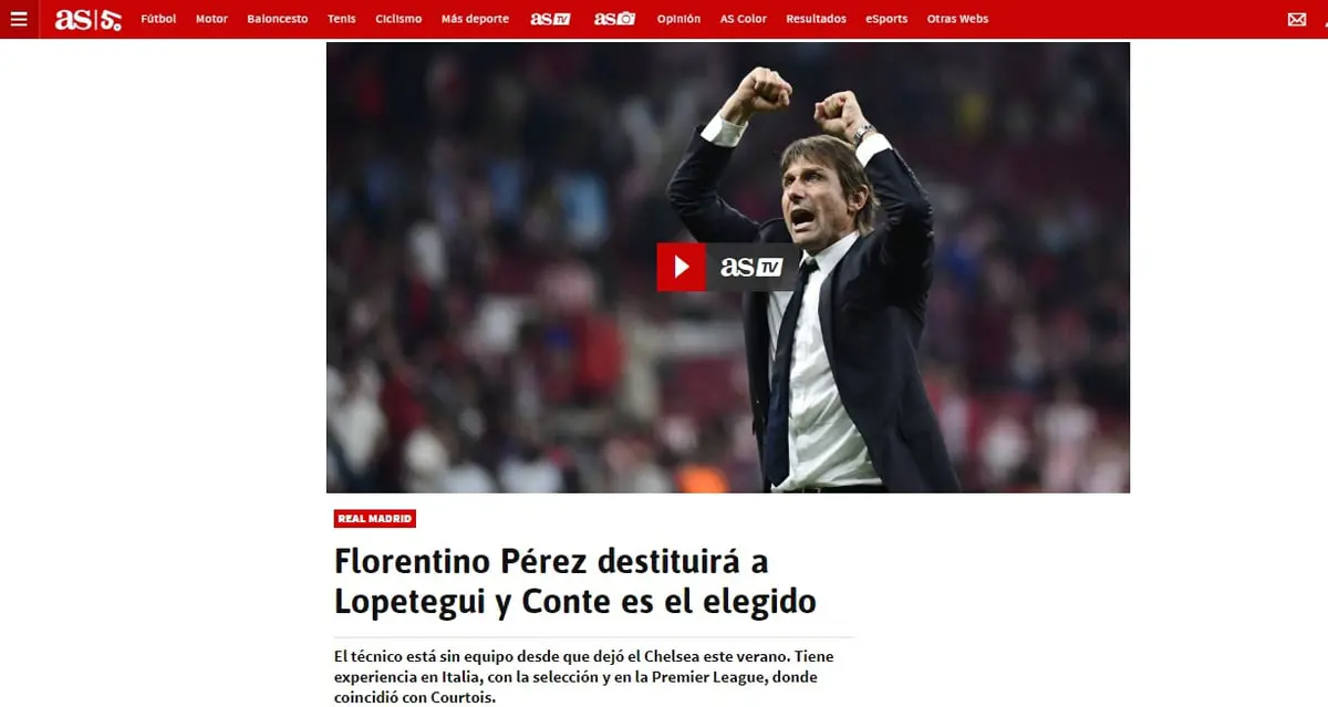 ووفقًا لصحيفة "أس" فإن بيريز سيقيل لوبتيغي وسيعين المدرب الإيطالي أنطونيو كونتي مدربًا للفريق غدًا الإثنين.