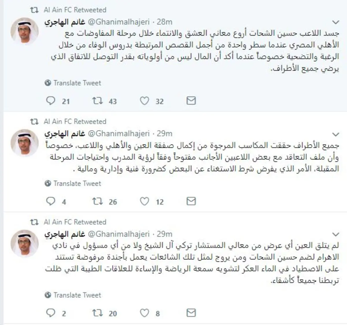 وأكد: "لم يتلقَّ العين أي عرض من معالي المستشار تركي آل الشيخ ولا من أي مسؤول في نادي بيراميدز لضم الشحات، ومن يروج لمثل تلك الشائعات يعمل بأجندة مرفوضة تستند على الاصطياد في الماء العكر لتشويه سمعة الرياضة والإساءة للعلاقات الطيبة التي ظلت تربطنا جميعًا كأشقاء".