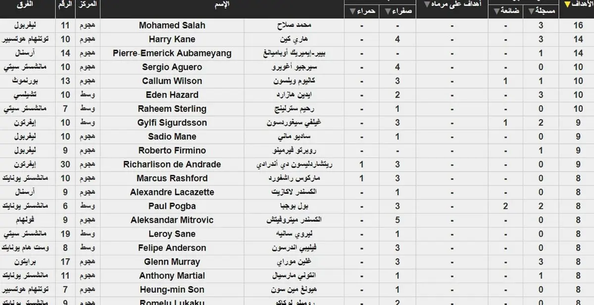 3. سيرجيو أغويرو ورحيم سترلينغ (مانشستر سيتي)، وكاليوم ويلسون (بورنموث)، وإدين هازارد، ولكل منهم 10 أهداف.