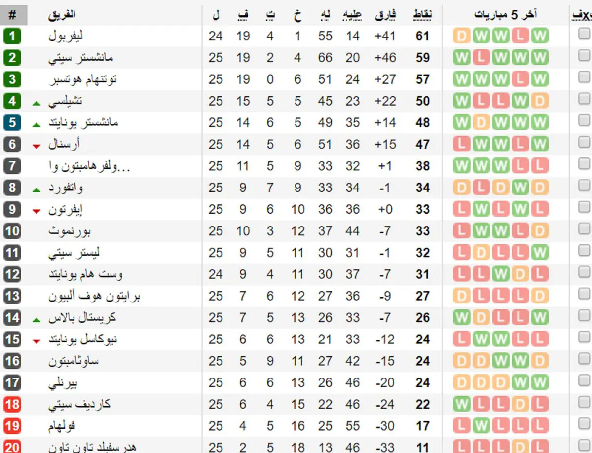 1. ليفربول، 61 نقطة من 24 مباراة.